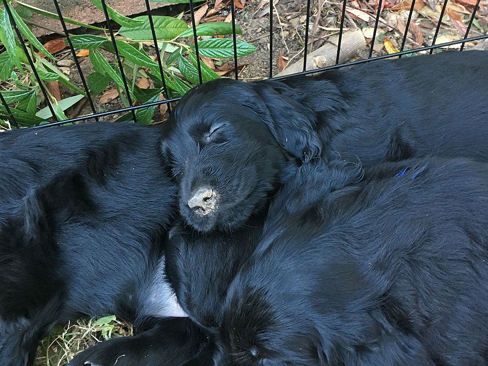 Dina’s Welpen sind schon vier Wochen alt und genießen die Sonne im Garten.